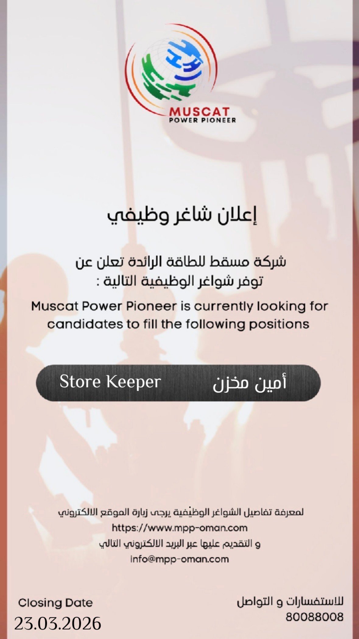 شركة مسقط للطاقة الرائدة - وظيفة شاغرة ( أمين مخزن )