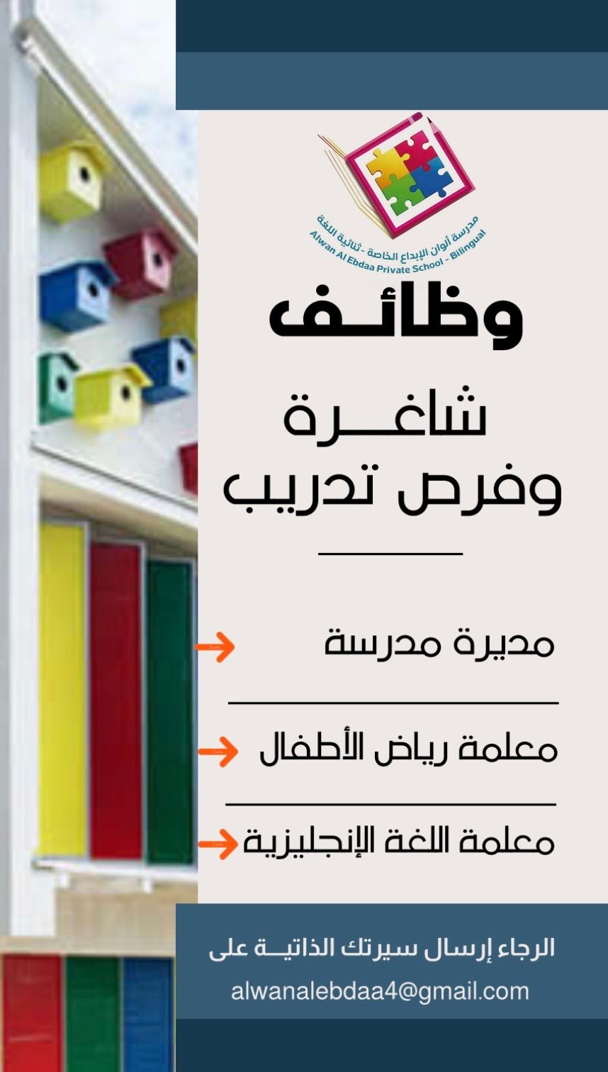 مدرسة ألوان الإبداع الخاصة - توفر وظيفة شاغرة مديرة ومعلمة اللغة الإنجليزية وفرصة تدريب مقرونة بالتشغيل لمعلمة رياض الأطفال