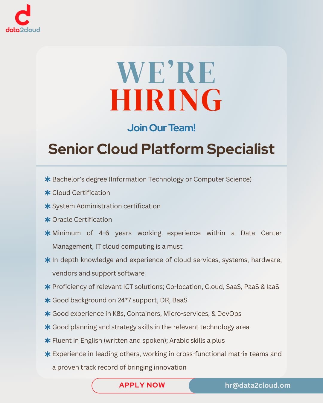 شركة داتا 2 كلاود - وظيفة شاغرة ( Senior Cloud Platform Specialist )