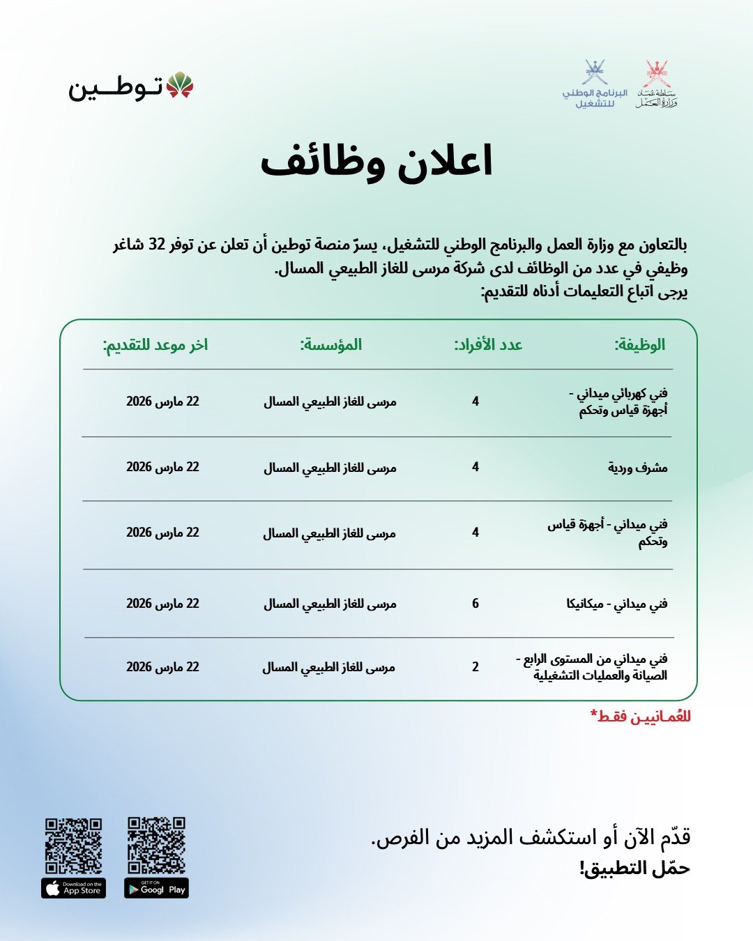 منصة توطين - توفر 32 شاغر وظيفي لدى شركة مرسى للغاز الطبيعي المسال