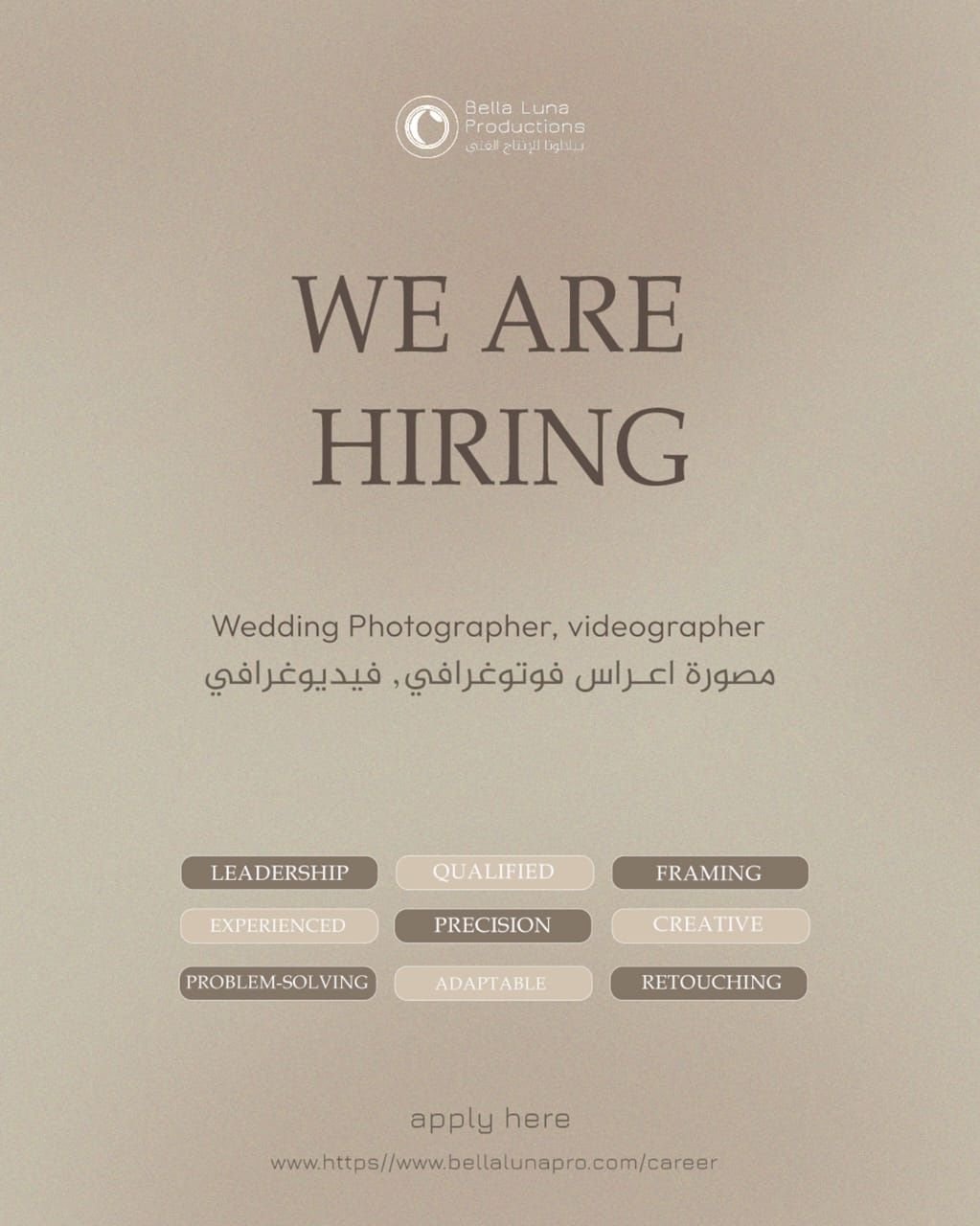 شركة Bella Luna Productions - وظيفة شاغرة ( مصورة أعراس )