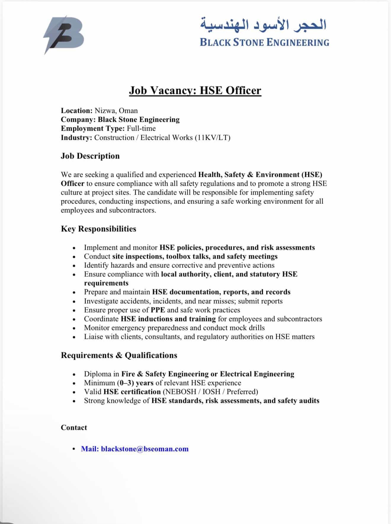 شركة الحجر الأسود الهندسية - وظيفة شاغرة ( HSE Officer )