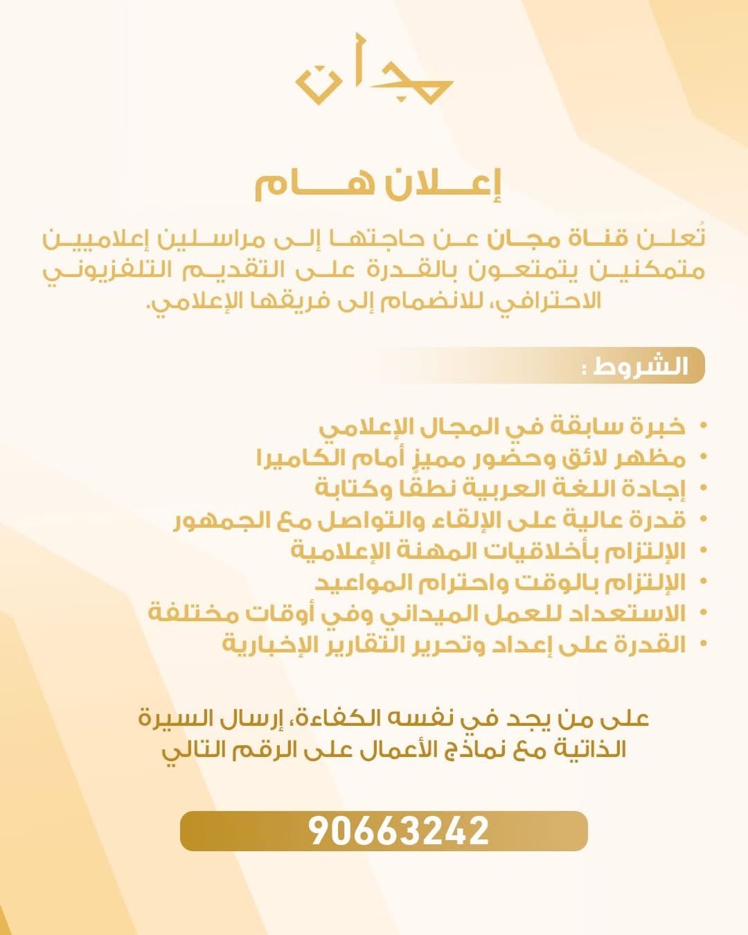 قناة مجان - فرصة شاغرة ( مراسلين إعلاميين متمكنين )