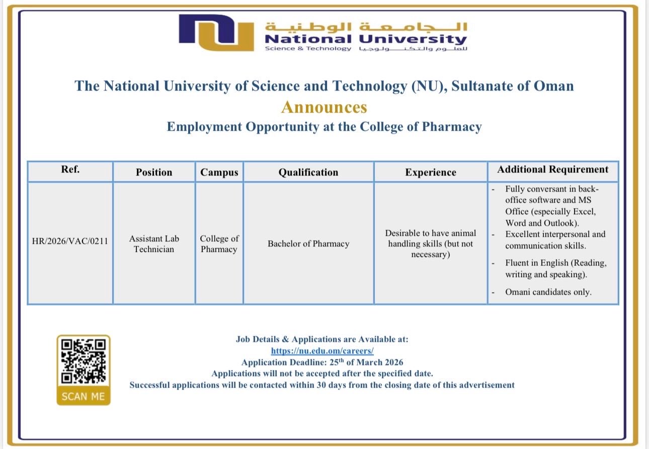 الجامعة الوطنية للعلوم والتكنولوجيا - وظيفة شاغرة ( Assistant Lab Technician )
