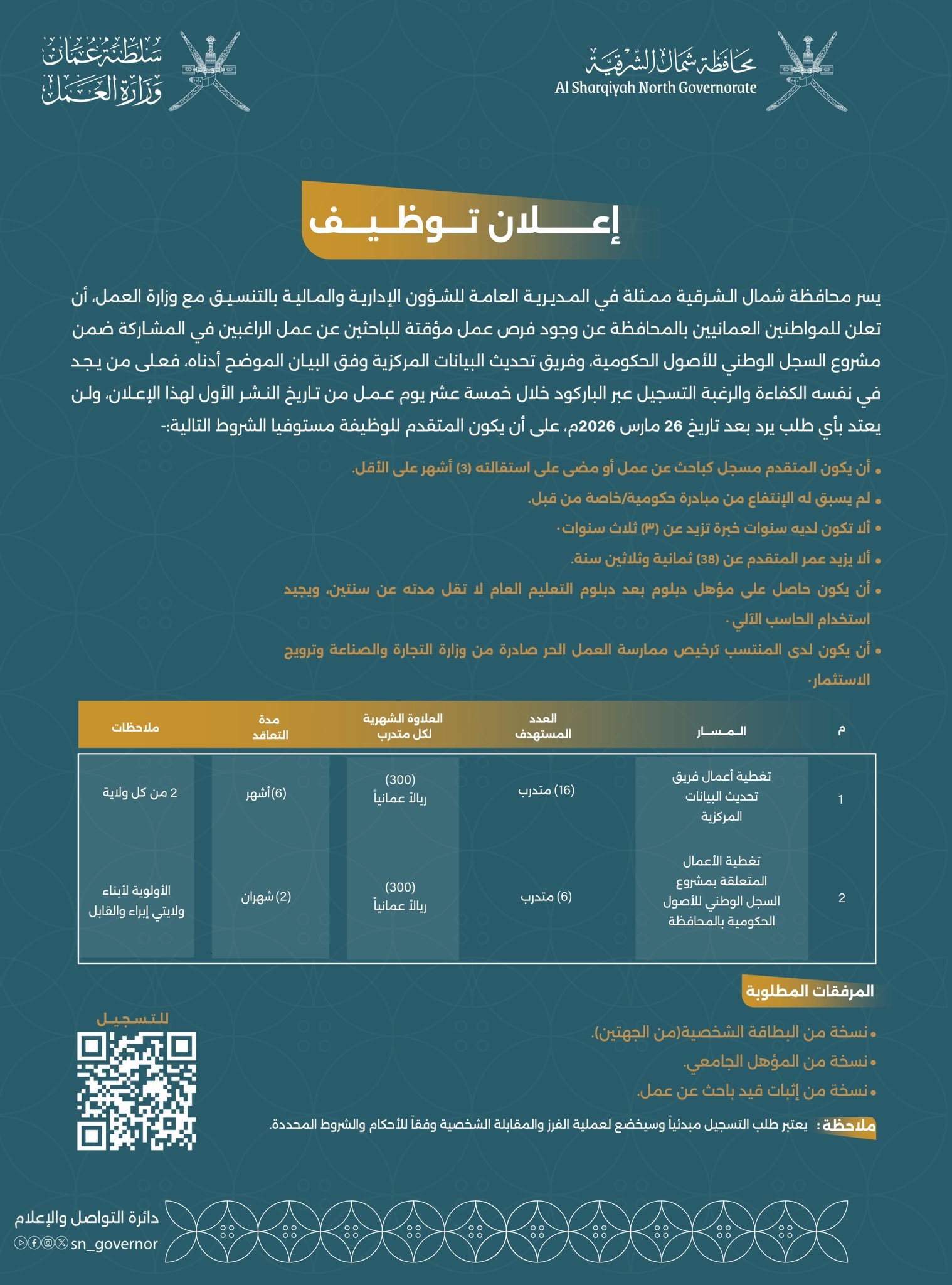 محافظة شمال الشرقية بالتنسيق مع وزارة العمل - توفر فرص عمل مؤقتة للمواطنين الباحثين عن عمل