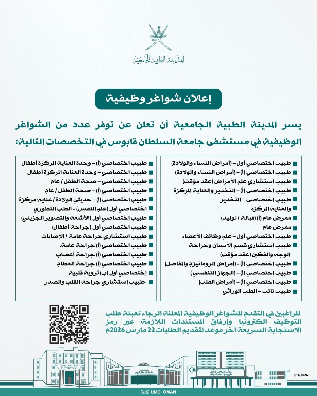 المدينة الطبية الجامعية - توفر شواغر وظيفية