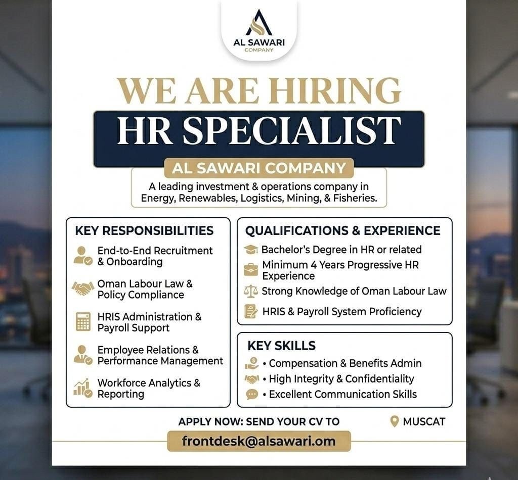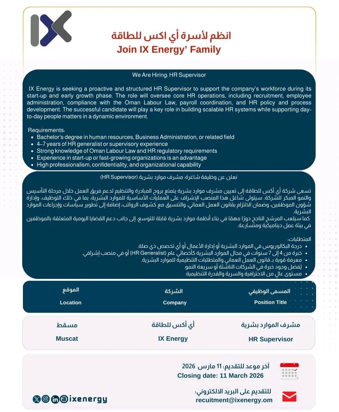 شركة أي أكس للطاقة في مسقط - وظيفة شاغرة ( مشرف الموارد البشرية )