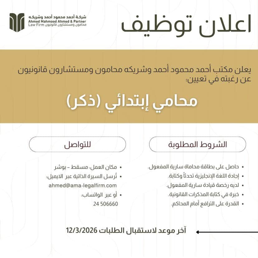 مكتب أحمد محمود أحمد وشريكه محامون ومستشارون قانونيون في بوشر - وظيفة شاغرة ( محامي ابتدائي )