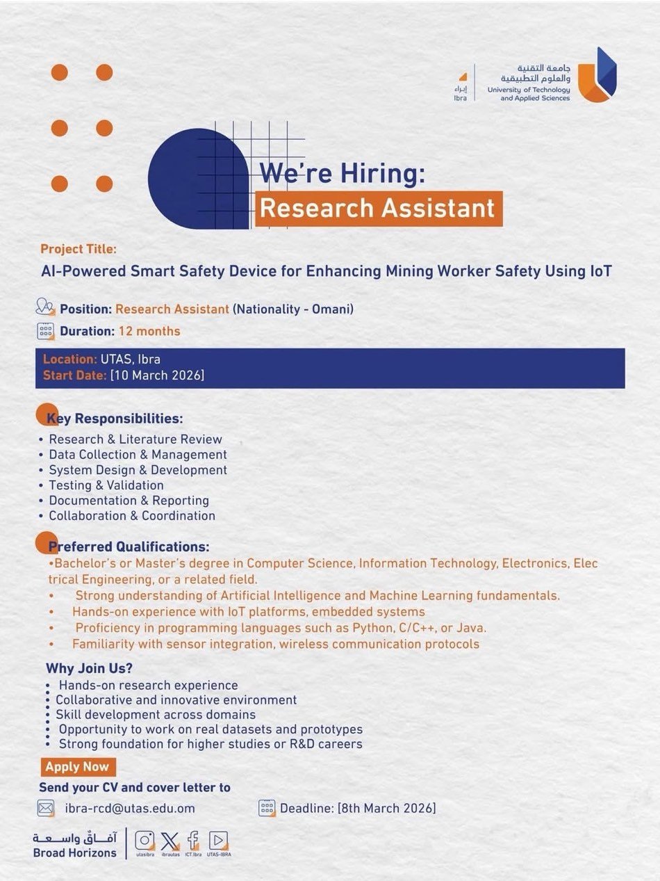 جامعة التقنية والعلوم التطبيقية بإبراء - وظيفة شاغرة ( مساعد باحث )