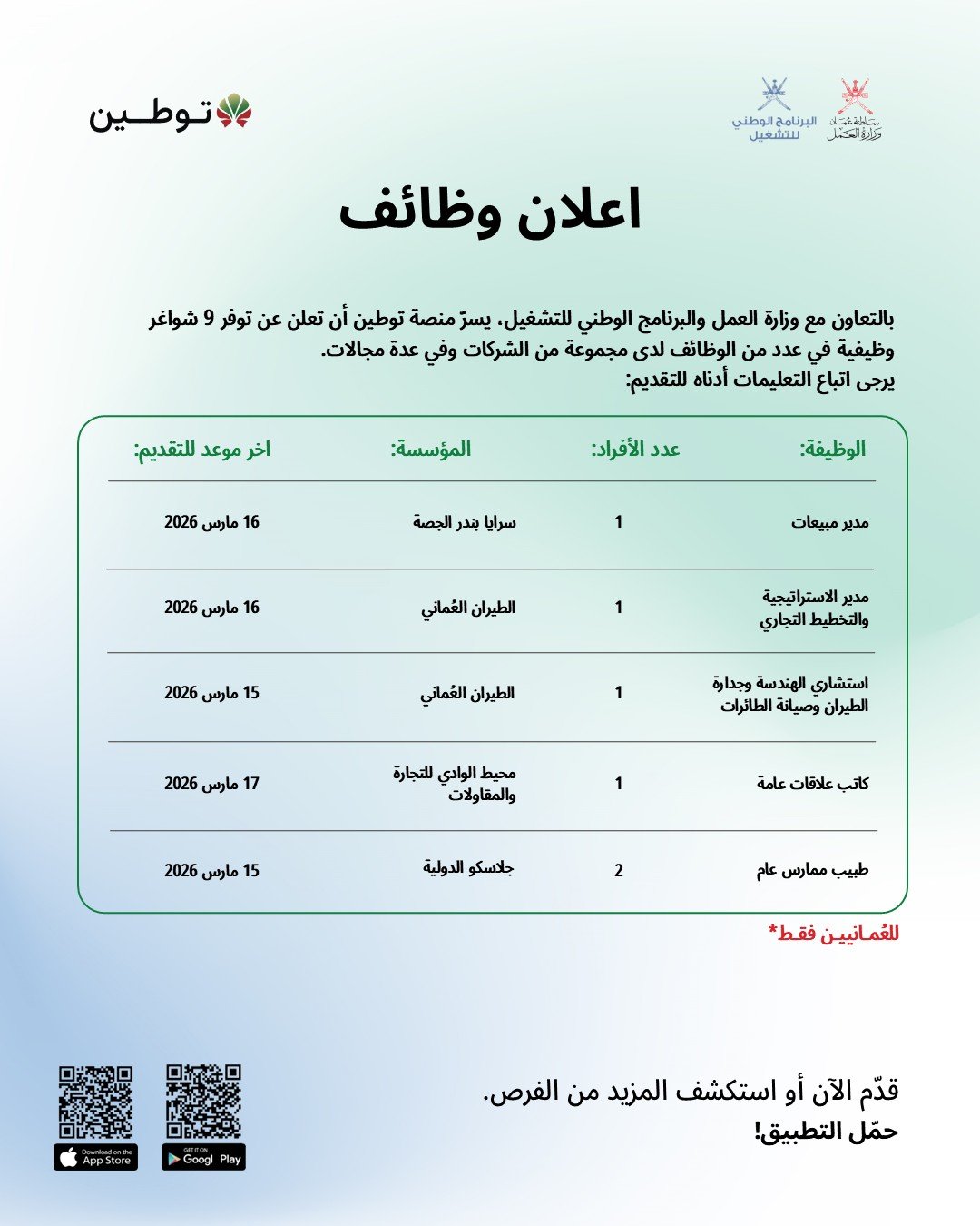 منصة توطين - توفر 9 شاغر وظيفي لدى مجموعة من الشركات وفي عدة مجالات