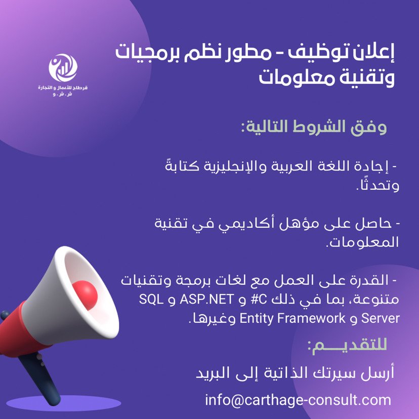 شركة قرطاج للأعمال والتجارة - وظيفة شاغرة ( مطور نظم برمجيات وتقنية معلومات )
