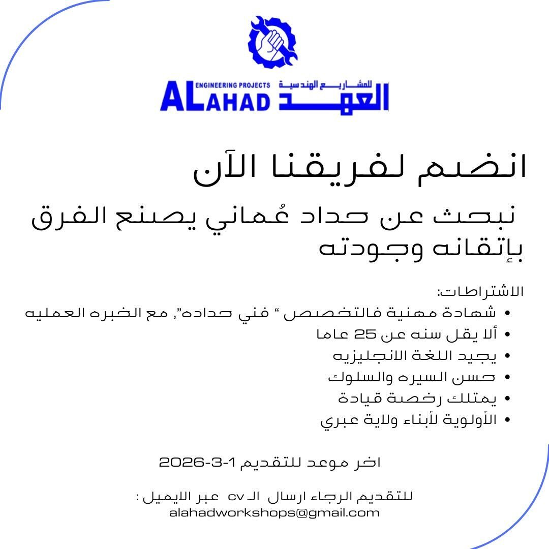 شركة العهد للمشاريع الهندسية في عبري - وظيفة شاغرة ( حداد )