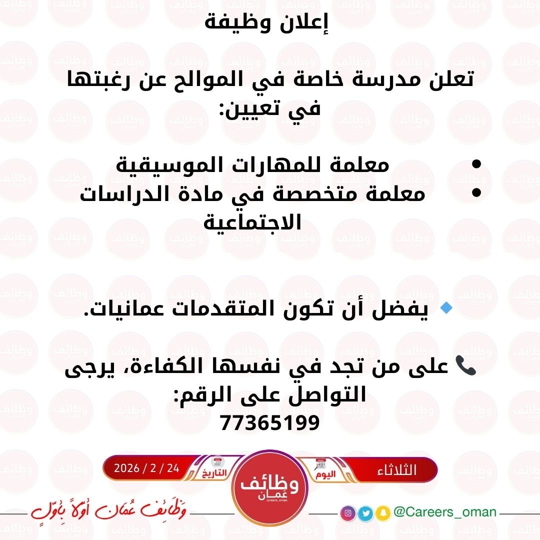 مدرسة خاصة في الموالح - وظيفتين شاغرتين ( معلمة مهارات الموسيقية + معلمة الدراسات الاجتماعية )