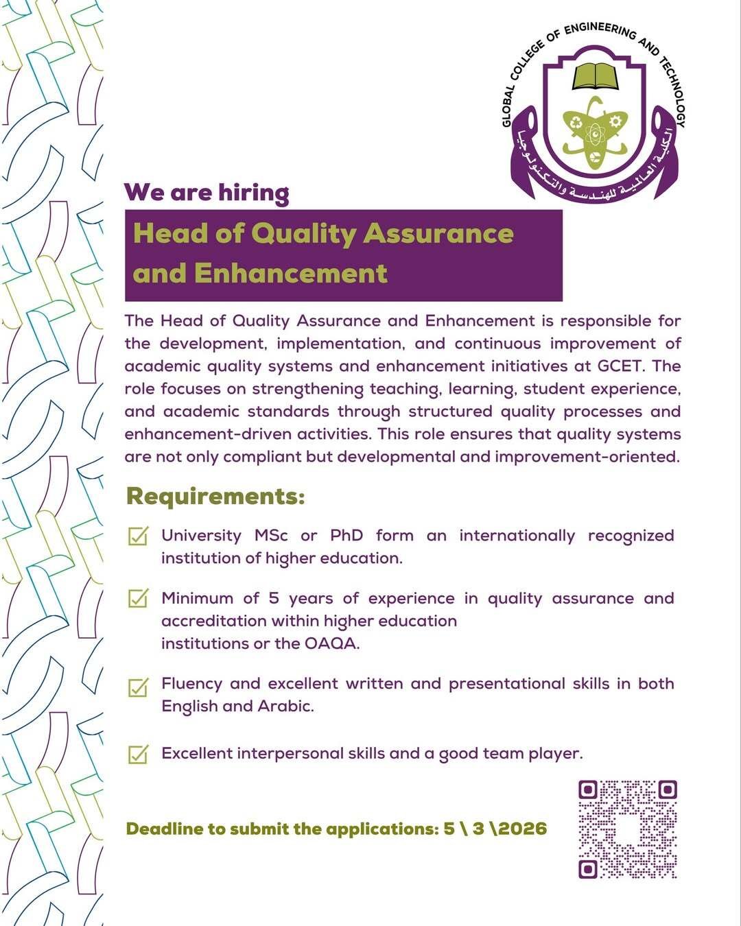 الكلية العالمية للهندسة والتكنولوجيا - وظيفتين شاغرتين