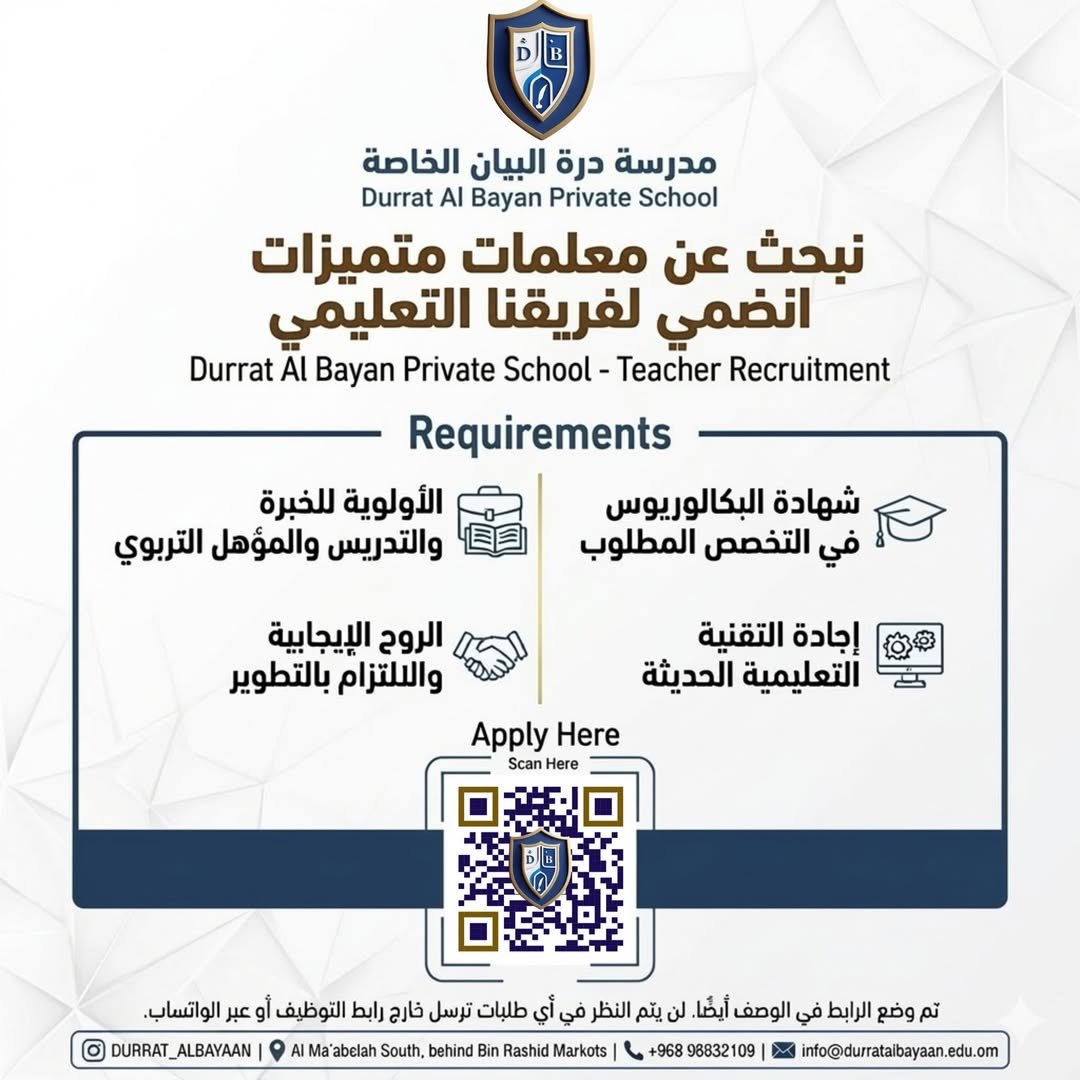 مدرسة درة البيان الخاصة في المعبيلة الجنوبية - فرصة شاغرة ( معلمات )